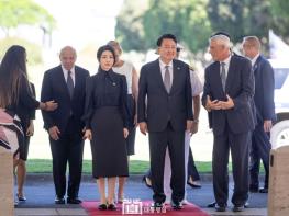 윤석열 대통령 부부는 오늘(현지 시각 7. 8, 월) 저녁 하와이 호놀룰루에서 현지 동포 약 120명을 초청해 만찬을 겸한 간담회를 가졌다.대통령 부부가 행사장 입구에 도착하자 ‘대통령님 내외의 하와이 방
