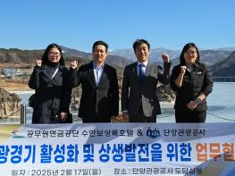 단양관광공사와 공무원연금공단 수안보 상록호텔(대표 전인호)이 충북 북부권 활성화를 위한 MOU를 체결했다. 지난 17일 도담삼봉 유원지 내에서 이루어진 업무협약식은 단양관광공사 김광표 사장과 수안보