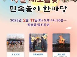 장흥군은 2월 11일 탐진강변에서 정월대보름맞이 민속놀이 한마당 행사를 개최한다고 밝혔다.이날 행사에는 윷놀이, 투호 놀이, 제기차기, 연날리기, 팽이치기 등 민속놀이 체험 등 남녀노소, 모든 세대가