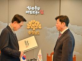 충남도는 24일 저녁 도청 접견실에서 박정주 신임 행정부지사가 김태흠 지사로부터 임명장을 받고 공식 업무에 들어갔다고 25일 밝혔다.홍성 출신인 박 부지사는 홍성고와 서울대를 졸업하고 1996년 제2회