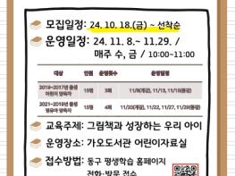 대전 동구는 다음 달 8일부터 29일까지 가오도서관에서 영유아(2021년 부터 2019년생) 및 어린이(2018 부터 2017년생) 양육자 30명을 대상으로 북스타트 양육자 교육을 개최, 참여 대상자를 선착순으로 모집