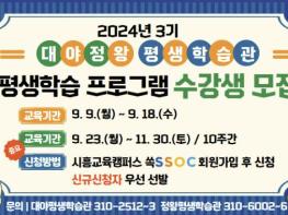 시흥시 대야ㆍ정왕평생학습관은 9월 9일부터 9월 18일까지 ‘2024년 3기 정규과정 평생학습 프로그램’ 수강생을 모집한다.대야평생학습관에서는 자격증 취득을 목표로 한 ‘정리수납전문가 2급’, ‘그림책