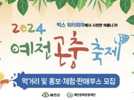 (재)예천문화관광재단은 ‘2024 예천곤충축제’ 기간 동안 축제장 내에서 먹거리 및 홍보ㆍ체험ㆍ판매 부스를 운영할 업체를 모집한다.2024 예천곤충축제는 오는 8월 15일부터 18일까지 한천체육공원 일원에
