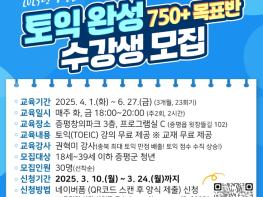 충북 증평군이 10일부터 24일까지 상반기 청년 교육 프로그램 ‘토익 완성 750+ 목표반’ 수강생 30명을 선착순 모집한다. 지역 내 거주하는 18 부터 39세 이하 청년이 대상이다.이번 프로그램은 토익 강의