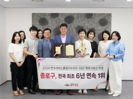 종로구가 한국표준협회 주관 '한국서비스품질지수(KS-SQI)' 지방자치단체 부문에서 전국 최초 6년 연속 1위의 영예를 안았다.한국서비스품질지수(KS-SQI)는 한국서비스산업의 품질수준을 나타내는 지표로 주