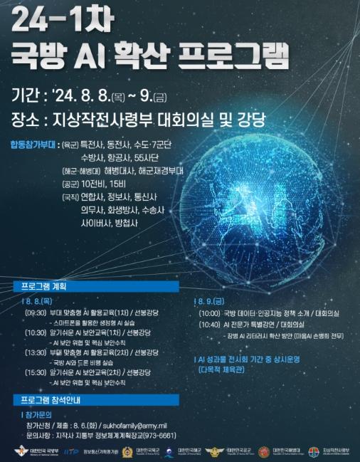 국방부는 전 장병의 인공지능(AI)에 대한 관심과 활용 능력 제고를 위한 ‘현장 밀착형 패키지 프로그램’인 ‘권역별?부대별 국방 AI 확산프로그램’을 추진한다.