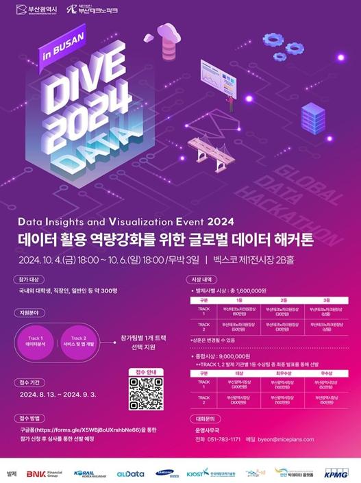 부산시는 올해 처음으로 개최하는 '세계적(글로벌) 데이터 해커톤 대회' '다이브(DIVE) 2024'의 참가자를 오늘(13일)부터 9월 3일까지 모집한다고 밝혔다.
