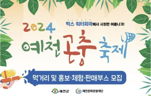 (재)예천문화관광재단은 ‘2024 예천곤충축제’ 기간 동안 축제장 내에서 먹거리 및 홍보ㆍ체험ㆍ판매 부스를 운영할 업체를 모집한다.