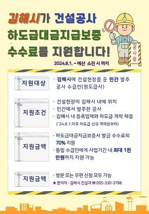 사업은 김해시가 기초지자체로써는 최초로 시행하는 사업으로, 김해지역 건설업체에 하도급을 주는 원도급 건설사에 건설공사 하도급대금 지급보증서 발급에 소요되는 수수료의 70%를 지원하는 사업이며 업체당 최대 1000만원까지 지원한다.