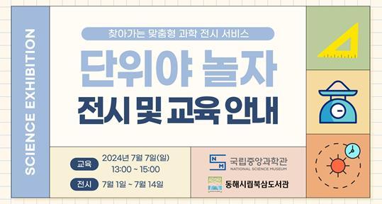 ‘찾아가는 맞춤형 과학 전시 서비스’는 북삼도서관의 유휴공간을 활용하여 국민 누구나 과학을 가깝고 쉽게 접할 수 있는 국립중앙과학관의 소장품을 이용하여‘단위야 놀자’라는 주제로 진행하는 맞춤형 과학 컨텐츠이다.