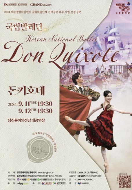 (재)당진문화재단·당진문예의전당은 오는 9월 국내 최정상 국립발레단의 '돈키호테'를 공연한다. 전 세계에서 가장 화려하고 유쾌한 작품으로 사랑받고 있는 클래식 발레 '돈키호테'는 극작가 세르반테스의 소설을 모티브로 1869년 마리우스 프티파가 초연한 작품이다. 발레는 원작 소설과 다르게 가난한 이발사 ‘바질’과 발랄한 매력의 선술집 딸 ‘키트리’의 사랑이야기에 초점을 맞춘다.