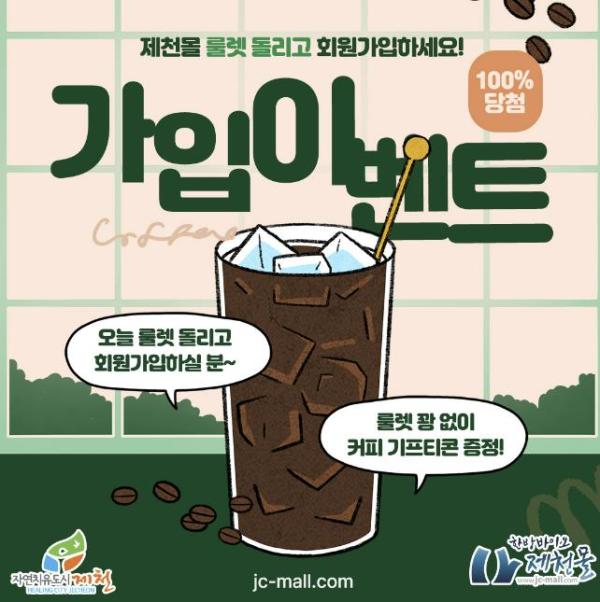 룰렛 이벤트는 온라인 공식몰(jc-mall.com) 배너와 인스타그램 및 페이스북 광고를 통해 제천몰 신규 회원가입 시, 누구든지 참여할 수 있으며 100% 당첨 음료 모바일 상품권을 증정한다.