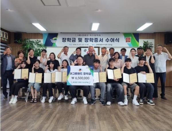 재단법인 김태신 삭주장학회는 지난 7일 예산군 고덕면 행정복지센터를 방문해 ‘아그로랜드(태신목장) 장학금’을 전달했다.