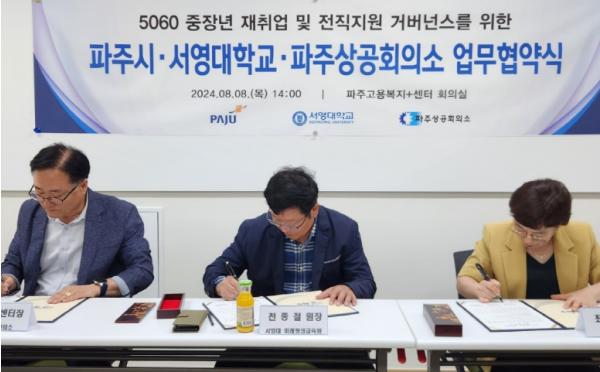 파주시는 지난 8일 서영대, 파주상공회의소와 파주시 중장년의 취업 역량 지원을 위한 업무협약을 체결했다.