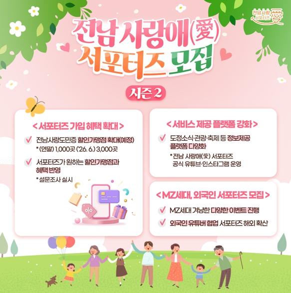 특히 서포터즈가 실질적 혜택을 받도록 전남지역 소상공인연합회, 상인연합회, 한국외식업중앙회, 휴게음식업중앙회, 대한숙박업서부·남부지회, 씨월드고속훼리 등 7개 단체와 전남사랑도민증 할인가맹점 가입 업무협약을 진행한다. 이를 통해 현재 259곳인 할인가맹점을 연말까지 1천 곳, 2026년 6월까지 3천 곳으로 확대한다는 목표다.