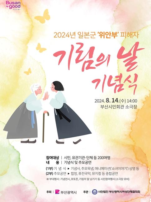 부산시는 내일(14일) 오후 2시 부산시민회관 소극장에서 '2024년 제7회 일본군 '위안부' 피해자 기림의 날 기념행사'를 개최한다고 밝혔다.