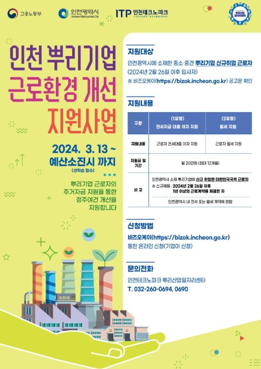이 사업은 고용노동부가 지원하고 인천시가 주관하는 ‘지역형 플러스 일자리 사업’의 일환으로, 뿌리기업 근로자가 계약한 주택 전·월세 비용을 일부 지원함으로써 주거 안정성을 확보하고 장기근속을 유도하는 사업이다.
