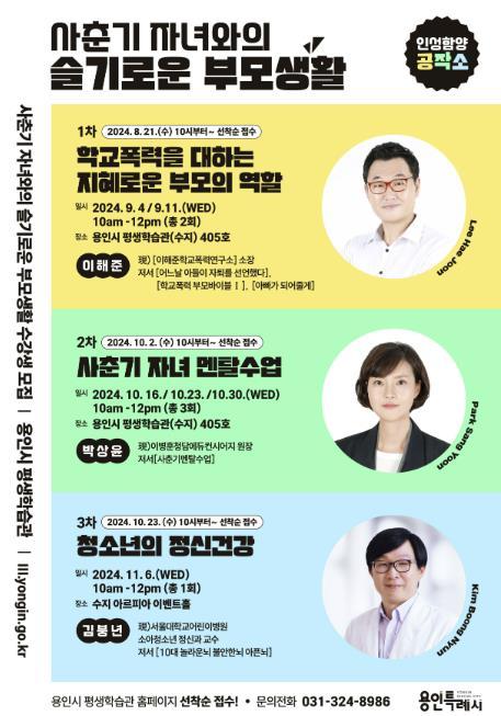 용인특례시는 사춘기 자녀를 둔 학부모를 위해 전문가 3인을 초청해 ‘사춘기 자녀와의 슬기로운 부모 생활’ 특강을 운영한다고 14일 밝혔다.
