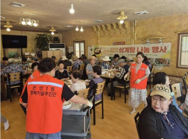 아산시 온양1동 행복키움추진단은 13일 관내 취약계층 70명을 초청하여 건강한 여름나기 삼계탕 나눔 행사를 실시했다.