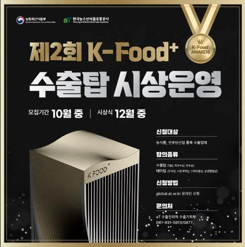 농림축산식품부는 '제2회 케이푸드 플러스(K-Food+) 수출탑'을 올해 12월에 시상할 계획이라고 밝혔다.