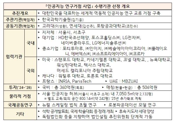 인공지능 연구거점은 서울 인공지능 중심지(AI 허브, 서울시 서초구 소재) 내 7,050.5㎡(약 2,132평) 등 규모로 조성되며, 국내 대학 뿐만 아니라 지자체, 대·중소 기업 등이 협력기관으로 참여하여 인공지능 산학연 생태계 집약과 인공지능 기반 산업 생태계 활성화 기능을 수행해나갈 계획이다.