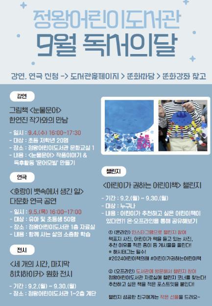 시흥시 정왕어린이도서관이 오는 9월 독서의 달을 맞아 어린이들을 대상으로 다양한 문화행사를 운영한다.