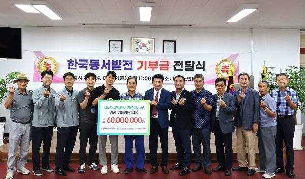 한국동서발전은 8월 19일 (재)서산시복지재단에 ‘대한노인대학 환경개선을 위한 기능보강사업’을 위한 기부금 6,000만원을 전달했다.