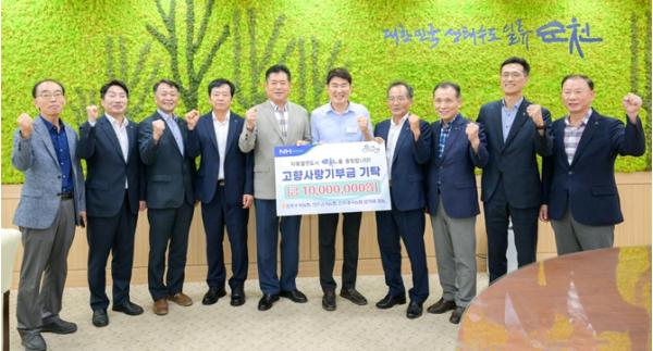 노관규 순천시장이 20일 순천시청에서 순천?진주 농?축협 임직원들과 고향사랑 상호 기부 기탁식을 가진 후 기념사진을 찍고 있다.