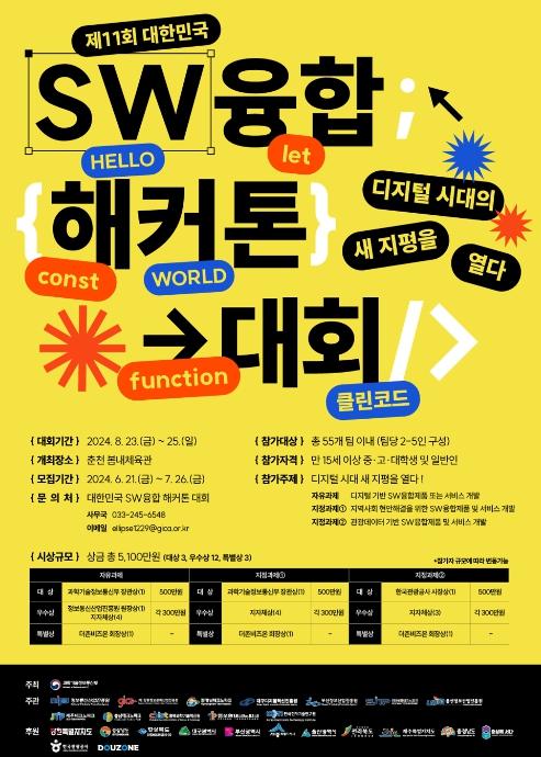 과학기술정보통신부는 지역에서 소프트웨어(이하 ‘SW’)를 활용한 창의적인 아이디어와 신서비스를 발굴하고, 지역 디지털 혁신 성과를 확산하기 위한 제11회 ‘대한민국 소프트웨어융합 경진(해커톤) 대회’를 강원도 춘천시에서 8월 23일부터 25일까지 개최한다.