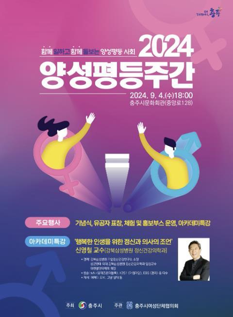 충주시는 양성평등주간을 맞아 오는 2일부터 5일까지 양성평등 전시회와 기념식 등 다양한 행사를 개최한다.