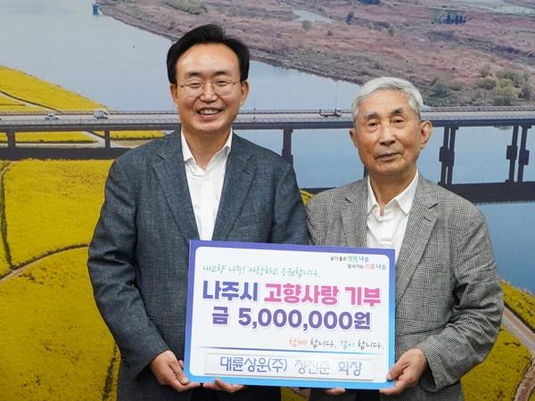 전라남도 나주시는 ㈜대륜상운 정찬준 회장이 고향사랑기부금 500만원을 기탁했다고 12일 밝혔다.