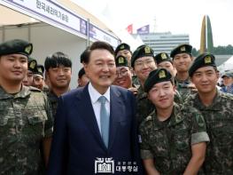 대통령이 박람회장 부스를 이동할 때마다 군복을 입은 장병들은 대통령 주변으로 몰려와 “충성”하며 거수경례했다. 대통령은 장병들에게 소속은 어디인지 물으며 한명 한명과 악수를 하면서 국가 안보를 위해 고생하는 장병들을 격려했다. 대통령은 또한 장병들의 사진 촬영 요청에 흔쾌히 응하며 즉석에서 기념 촬영을 했다. 이에 장병들은 대통령에게 “감사합니다”를 외치며 거수경례했다.