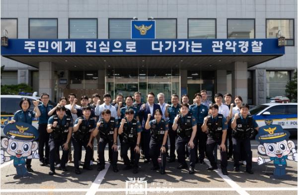 격려 방문을 마친 대통령은 관악경찰서 및 소속 지구대 직원들과 “지키자 시민안전, 관악 경찰 파이팅!”이라고 외치며 단체 사진을 찍었다. 경찰관들은 “대통령님, 사랑합니다”를 외치며 대통령을 환송했다.
