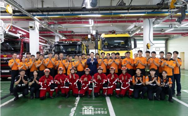 소방대원 격려를 마친 대통령은 “서울시민을 지키는 강서소방서, 파이팅!”이라고 외치며 단체 사진을 찍었다. 단체 사진 촬영 후에도 대통령은 소방서 팀별, 개인 셀카를 함께 찍으며 소방대원들을 격려했다.