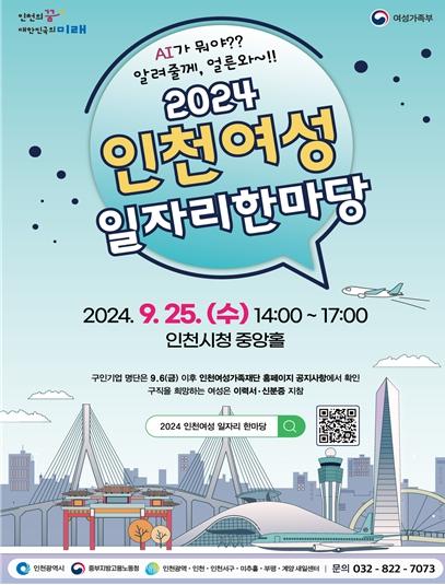 인천광역시는 9월 25일 인천시청 중앙홀에서 취업을 희망하는 여성들에게 다양한 취업 기회를 제공하는 ‘2024 인천여성 일자리 한마당’ 행사를 개최한다고 밝혔다.