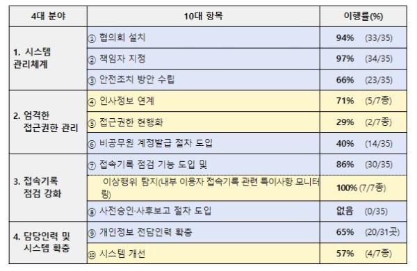 그러나, 접근권한 현행화(29%), 비공무원 계정발급 절차 도입(40%)은 이행률이 저조했고, 이상행위 탐지(내부 이용자 접속기록 관련 특이사항 모니터링) 및 사전승인·사후보고 절차 도입 등은 이행이 더뎌 향후 추가적인 개선이 필요한 것으로 조사됐다.