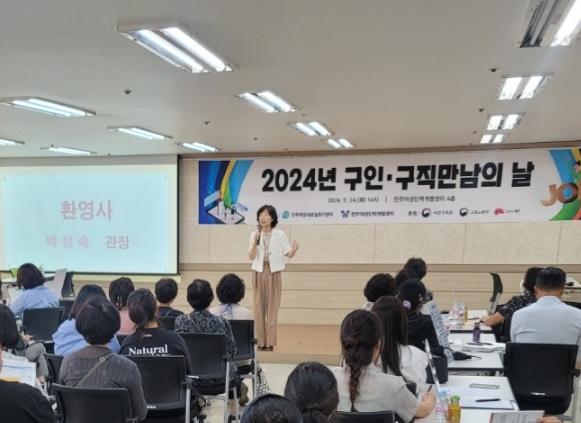 전주여성인력개발센터는 24일 센터 4층 민들레홀에서 직업교육훈련 및 집단상담프로그램 수료생과 여성 구직자 등 취업을 희망하는 여성 100여 명이 참여한 가운데 경력이 단절된 여성들의 재취업 성공과 도약을 응원하기 위한 ‘구인·구직 만남의 날’을 개최했다.
