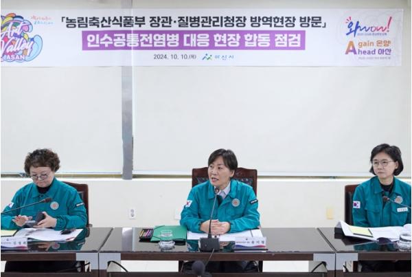 아산시는 농림축산식품부, 질병관리청, 농촌진흥청, 충청남도, 충남도 보건환경연구원 등이 함께하는 인수공통전염병 방역관리를 위한 현장 점검 및 간담회가 10일 아산시 농업기술센터에서 열렸다고 밝혔다.