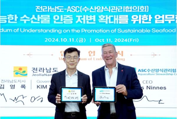 전라남도는 수산양식관리협의회(ASC)와 지역 우수 수산물의 수출 경쟁력 강화를 위해 수산물 국제인증 저변 확대 업무협약을 지난 11일 도청 서재필실에서 했다.