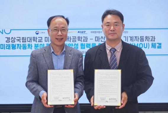 경상국립대학교 미래자동차공학과는 10월 11일 가좌캠퍼스 ICT 융합센터에서 ‘경상국립대 미래자동차공학과-마산대 기계자동차과 간 업무협약’을 체결했다. 이날 업무협약은 ‘미래형자동차 기술융합혁신인재양성사업’의 일환으로 추진됐다.