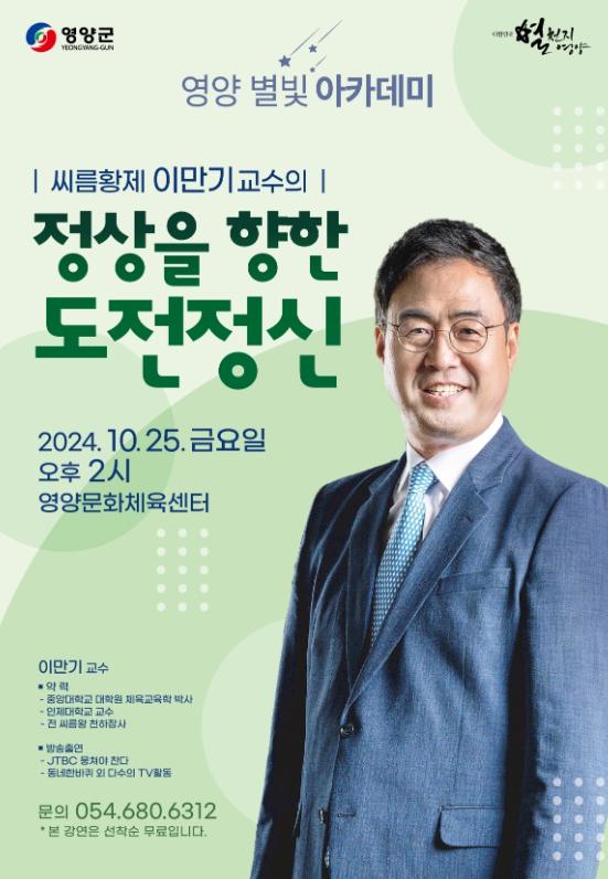 이번 영양 별빛 아카데미에서는 인제대학교 이만기 교수를 초청해 ‘정상을 향한 도전정신’을 주제로 강연이 진행될 예정이다.