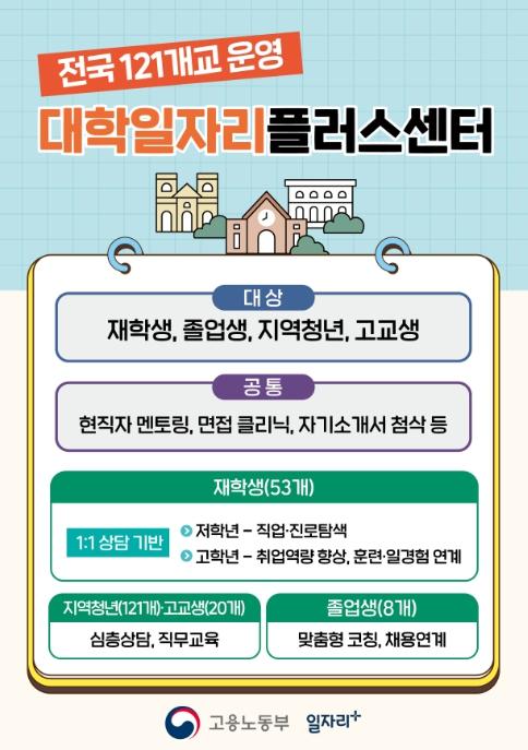 대학일자리플러스센터는 전국 121개 대학에 설치되어, 재학생, 졸업생, 지역 청년을 위한 맞춤형 취업지원 서비스를 제공하고 있다. 특히, 올해 8월부터는 8개 대학에서 미취업 졸업생을 발굴하여 취업지원하는 시범사업을 진행 중이다. 건국대학교는 시범사업에 참여하여, 졸업생 전담 컨설턴트가 1:1로 컨설팅하고 서류·면접 탈락자에게 맞춤형으로 코칭하는 프로그램을 운영 중이다. 내년부터는 국가장학금 신청자 정보와 고용정보를 연계하여 6만명의 미취업 졸업생을 대상으로 찾아가는 서비스를 제공할 계획이다.