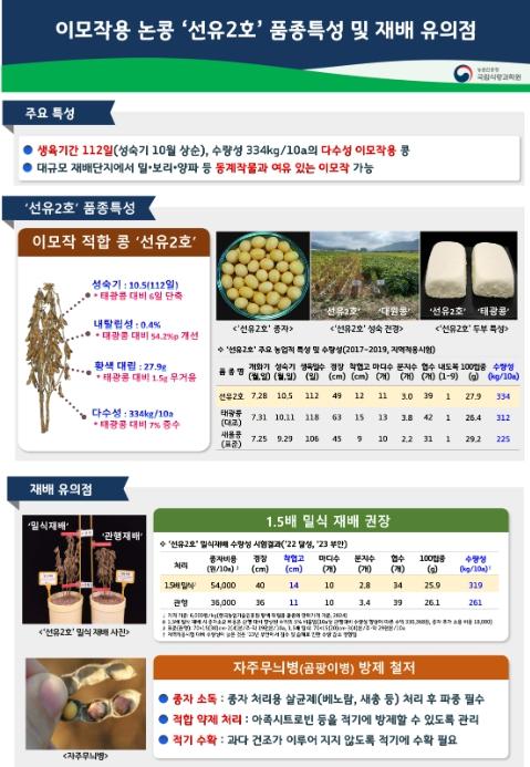 농촌진흥청 남부작물부 정병우 부장은 “‘선유2호’는 꼬투리가 잘 터지지 않고 알이 굵으며 수확량도 많아 우수한 이모작용 콩이다. 논에 심을 때 관행보다 빽빽이 심으면 안정재배와 더불어 수확량 증진도 기대할 수 있다.”라며, “앞으로도 협업연구농장과 현장 연구에 매진해 새롭게 개발한 기술이 현장에 신속히 전파될 수 있도록 노력하겠다.”라고 전했다.
