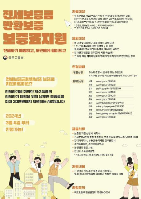 전세보증금 반환보증료 지원사업은 전세금 미반환으로 인한 피해를 예방하기 위해 임차인이 가입해 납부한 전세금 반환보증보증료의 전부 또는 일부를 최대 30만원까지 지원하는 사업이다.