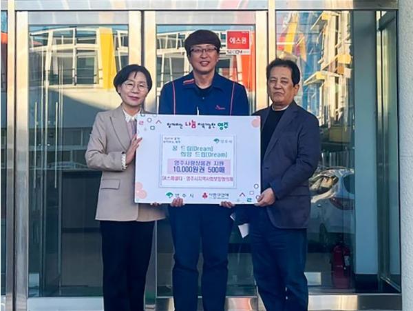 영주시드림스타트에서 열린 이날 기탁식에서 SK스페셜티는 영주사랑상품권 1만원권 500매(총 500만원)를 기부했다.