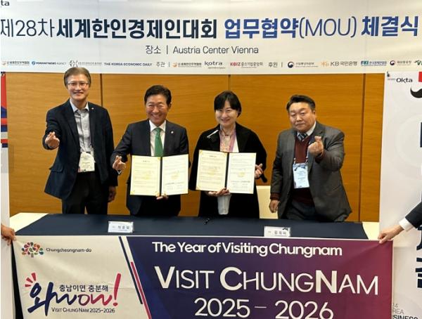 진흥원은 최근 오스트리아 비엔나에서 열린 '제28차 세계한인경제인대회'에 참가해 대회 주관사인 세계한인무역협회와 '충남 지역 스타트업 해외 파트너십 구축'을 위한 업무협약(MOU)을 체결했다고 29일 밝혔다.