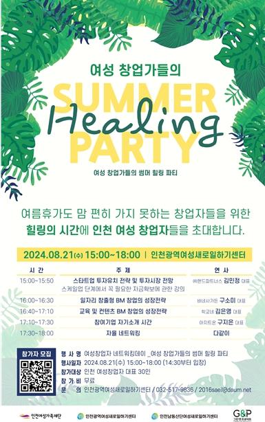 행사는 8월 21일 15시부터 18시까지 인천여성가족재단 본관 소강당에서 진행되며 행사내용은 △창업강연(스타트업 투자유치 전략 및 투자시장 전망, 일자리 창출형 BM 창업 성장전략, 교육및컨텐츠 BM 창업 성장전략), △힐링체험(ESG체험존(숲속 멸종위기 생물들과 나의 MBTI 연결고리 찾기, 포토존, 맞춤 케이터링 제공), △자율 네트워킹 시간(참여기업 자기소개 등)등으로 구성되어 있다.