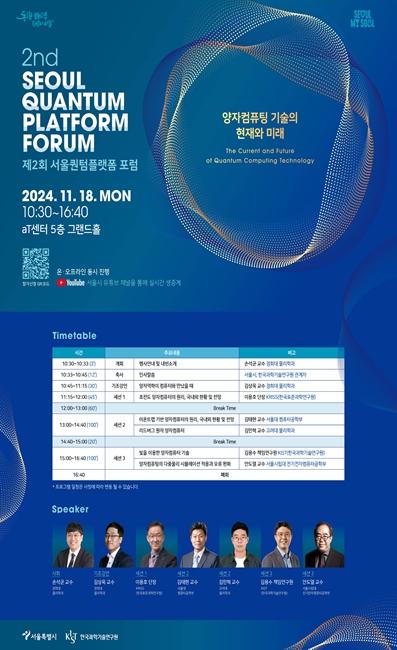 서울시는 한국과학기술연구원과 공동으로 11월 18일 오전 10시 30분, 양재 aT센터 5층 그랜드홀에서 ‘제2회 서울퀀텀플랫폼 포럼’을 개최한다고 밝혔다.