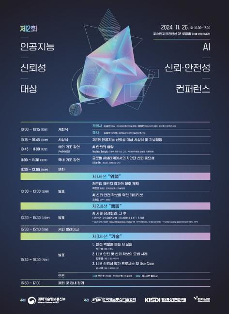 과학기술정보통신부는 11월 26일 피스앤파크컨벤션(서울 전쟁기념관)에서 국내를 대표하는 인공지능 분야 대기업?신생기업, 연구자 등 200여명이 참여하는 가운데, ‘인공지능 신뢰?안전성 학술회의’를 개최했다.
