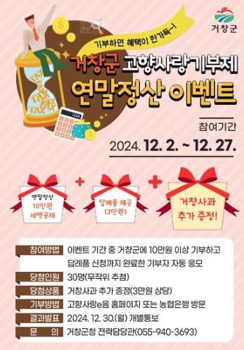 거창군은 연말정산 시기를 맞이하여 거창군 고향사랑기부제 기부자를 대상으로 연말정산 이벤트를 진행한다.